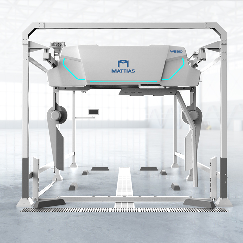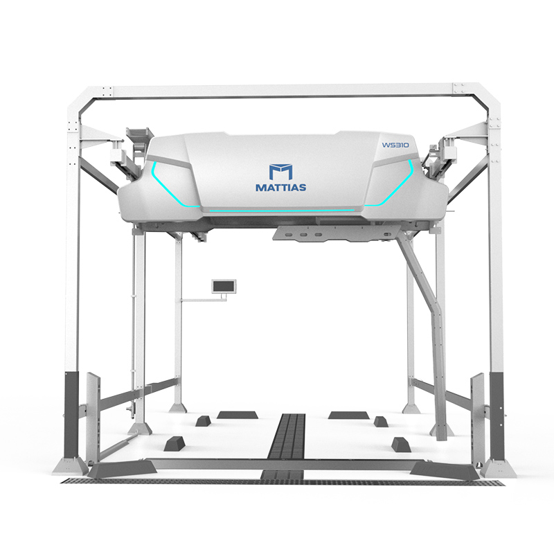 M-WS310 touchless car wash machine combines the action of three variable frequency drives to control the speed of linear motion, lateral movement, and spin. All of these controls, managed by advanced software, result in a highly effective and rapid touchless wash. This unique configuration means that the wash bay area is completely free of obstacles, and thus any type of vehicle can access it with ease and be washed by the user in complete safety.